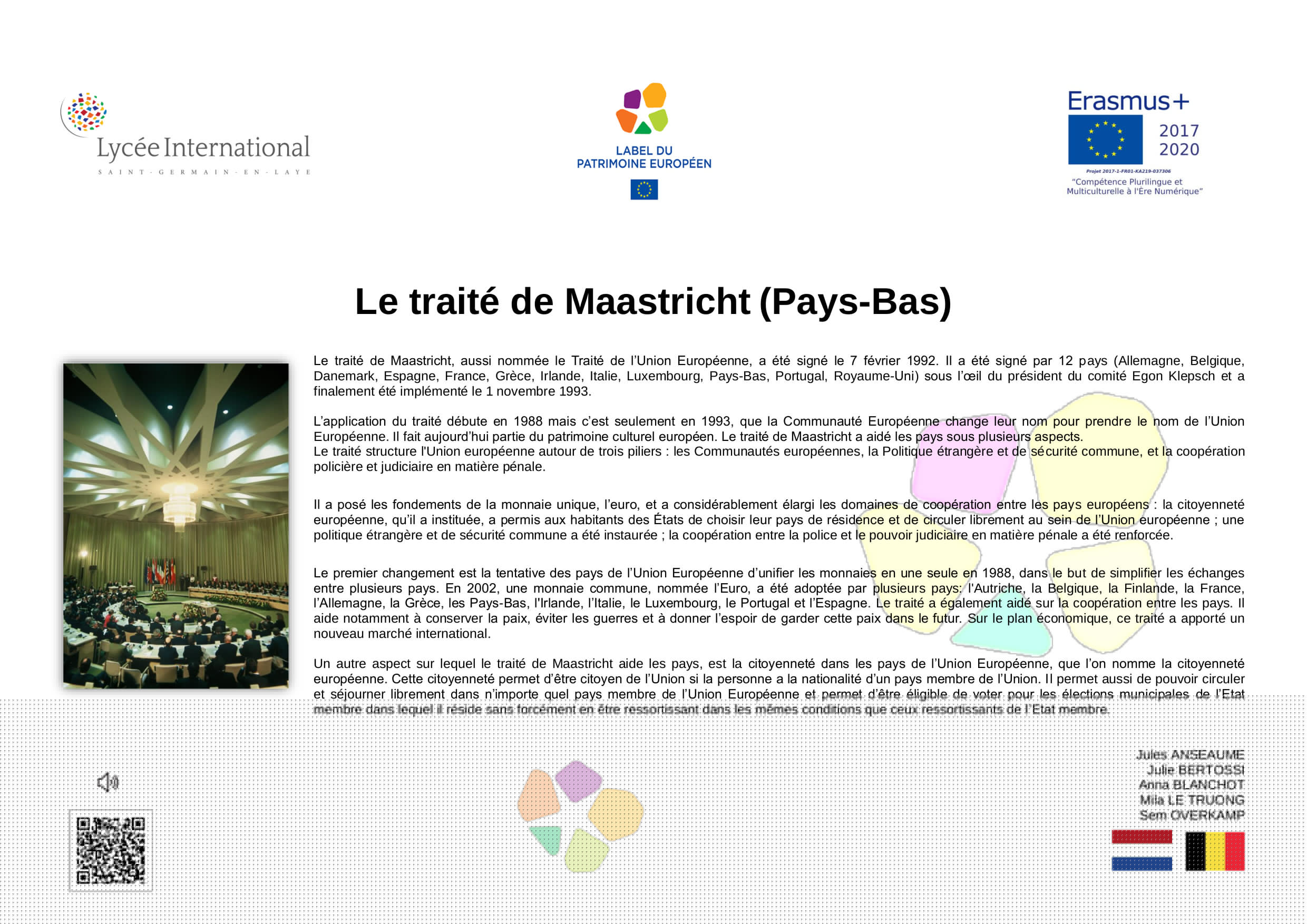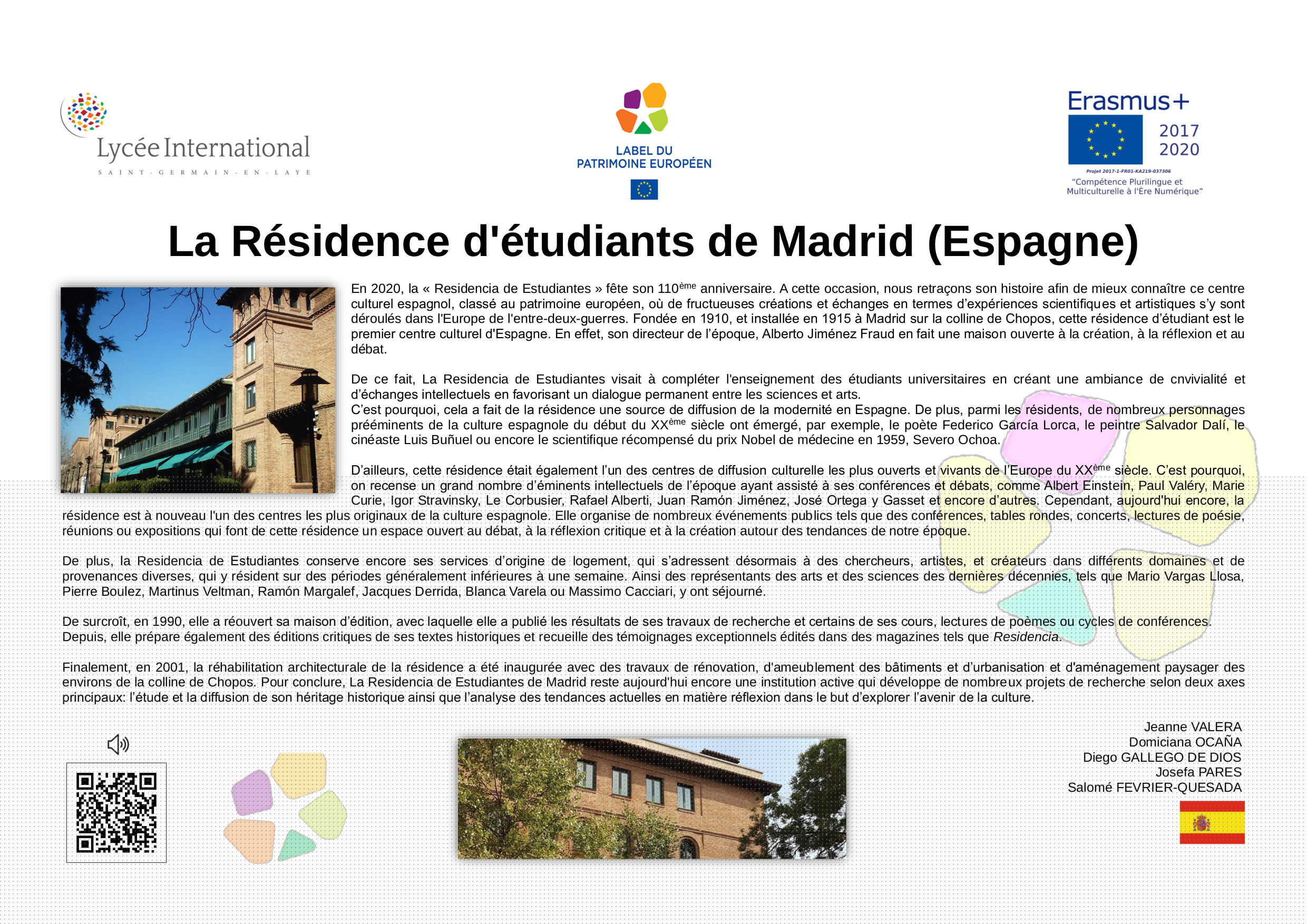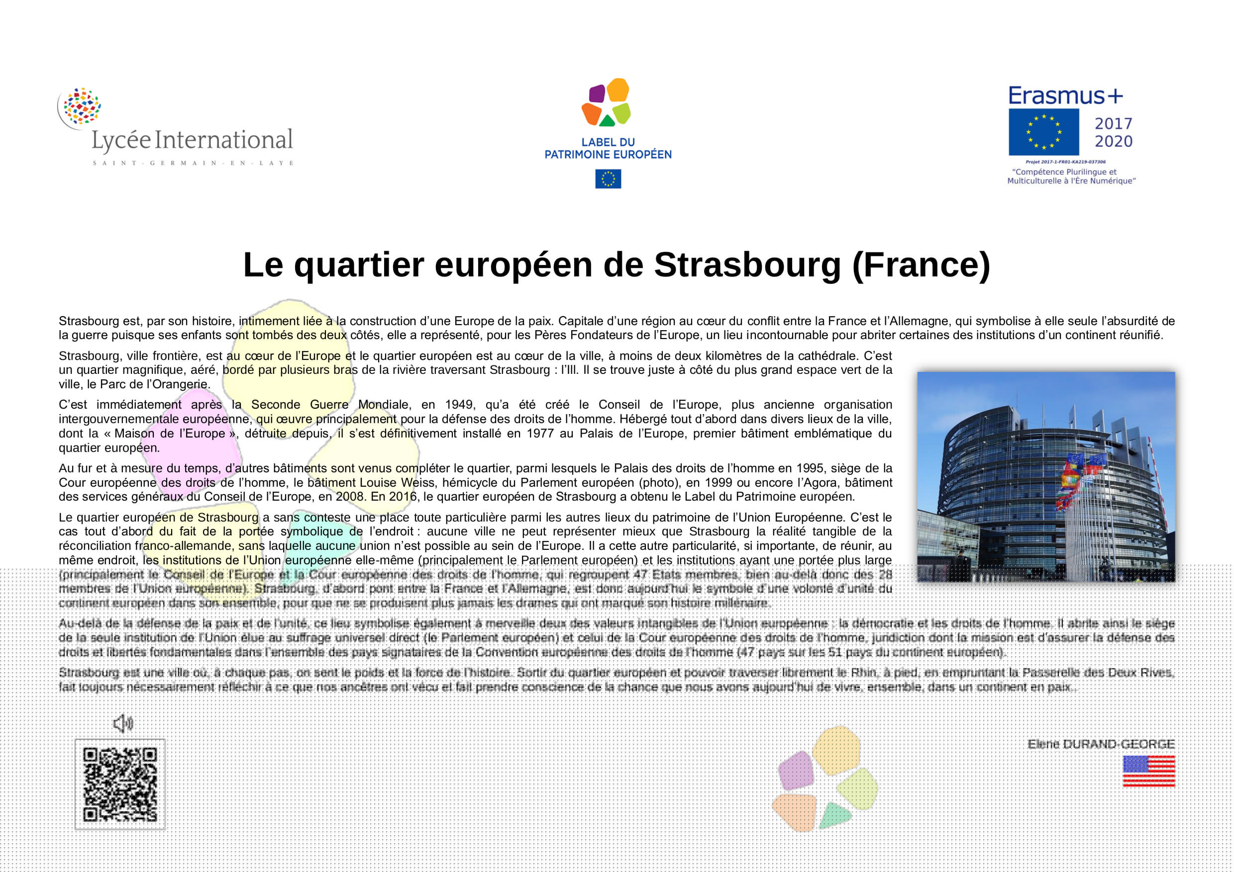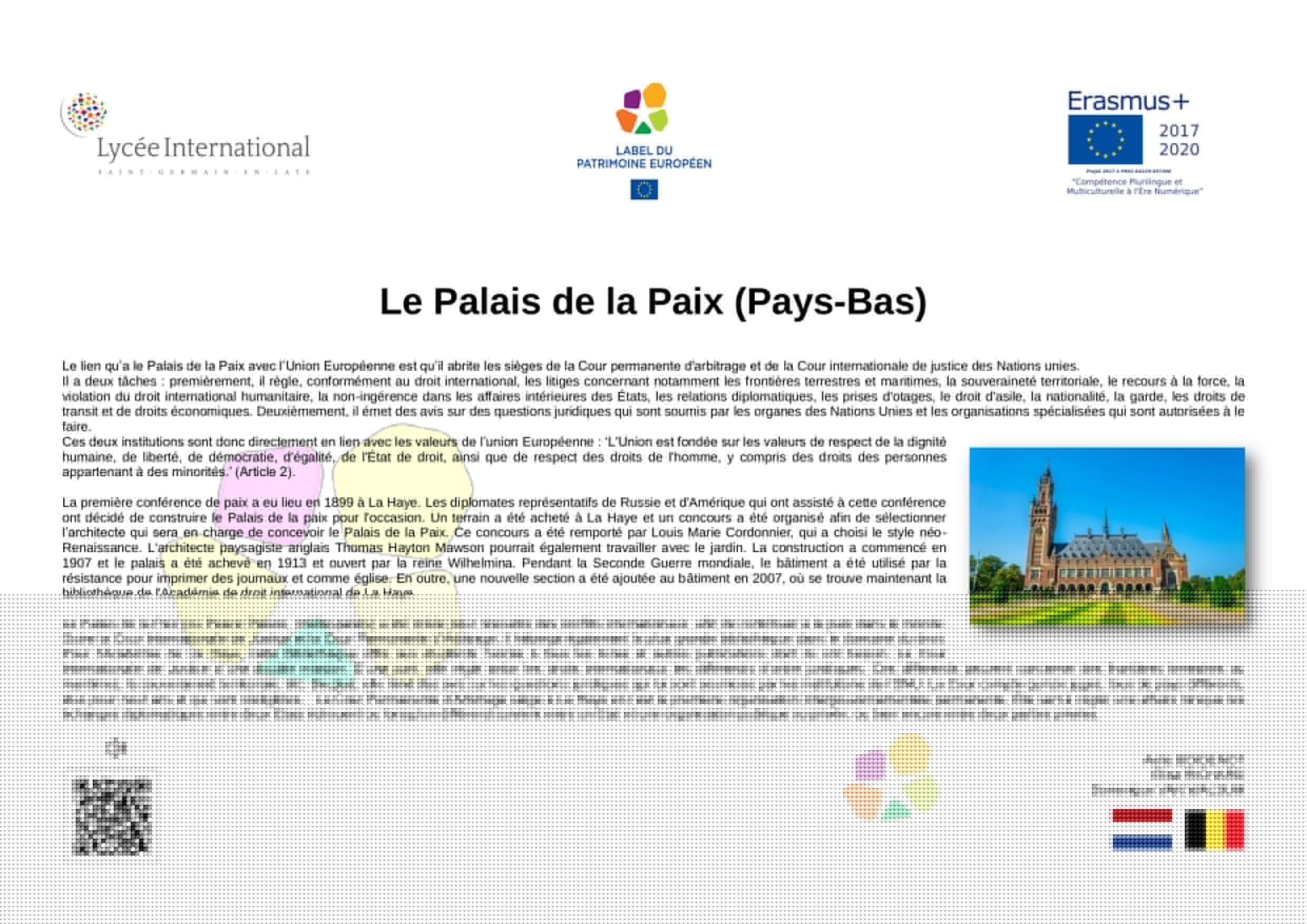 En 2005, à l’initiative de la France, différents États-membres de l’Union Européenne ont décidé de créer le Label du Patrimoine européen. Aujourd’hui repris par l’Union Européenne, le Label a pour objectif de mettre en valeur la dimension européenne de biens culturels, monuments, sites culturels, lieux de mémoire, etc.., témoins de l'histoire de l’Europe ou de la construction européenne.Ce label est décerné par l’Union européenne à des sites témoins de l'héritage européen et choisis pour leur valeur symbolique, le rôle qu’ils ont joué dans l’histoire européenne et les activités qu'ils proposent, qui doivent permettre de rapprocher les Européens de leur histoire commune et de l'Union européenne.Son objectif est d'aider les citoyens européens à mieux comprendre l’histoire de l’Europe et de la construction de l’Union ainsi que celle de leur patrimoine culturel commun, en particulier au regard des valeurs démocratiques et des droits de l’homme qui sous-tendent le processus d’intégration européenne, de sensibiliser les citoyens européens, notamment les jeunes, et de renforcer le dialogue interculturel, par l’éducation artistique, l’éducation à la culture et l’éducation à l’histoire.L'objectif de cette exposition est de diffuser, à travers les œuvres développées par les élèves de 2nde du Lycée International, les valeurs humanistes, la paix et l'espoir qui animent le projet d'unité européenne. La dimension internationale de notre établissement et sa vocation de lieu privilégié de rencontre culturelle et linguistique nous rend pleinement conscients et engagés dans l'effort collectif qui doit créer un avenir meilleur, plus juste, plus solidaire et plus responsable a l’égard de toute l'humanité et de la planète où nous habitons.