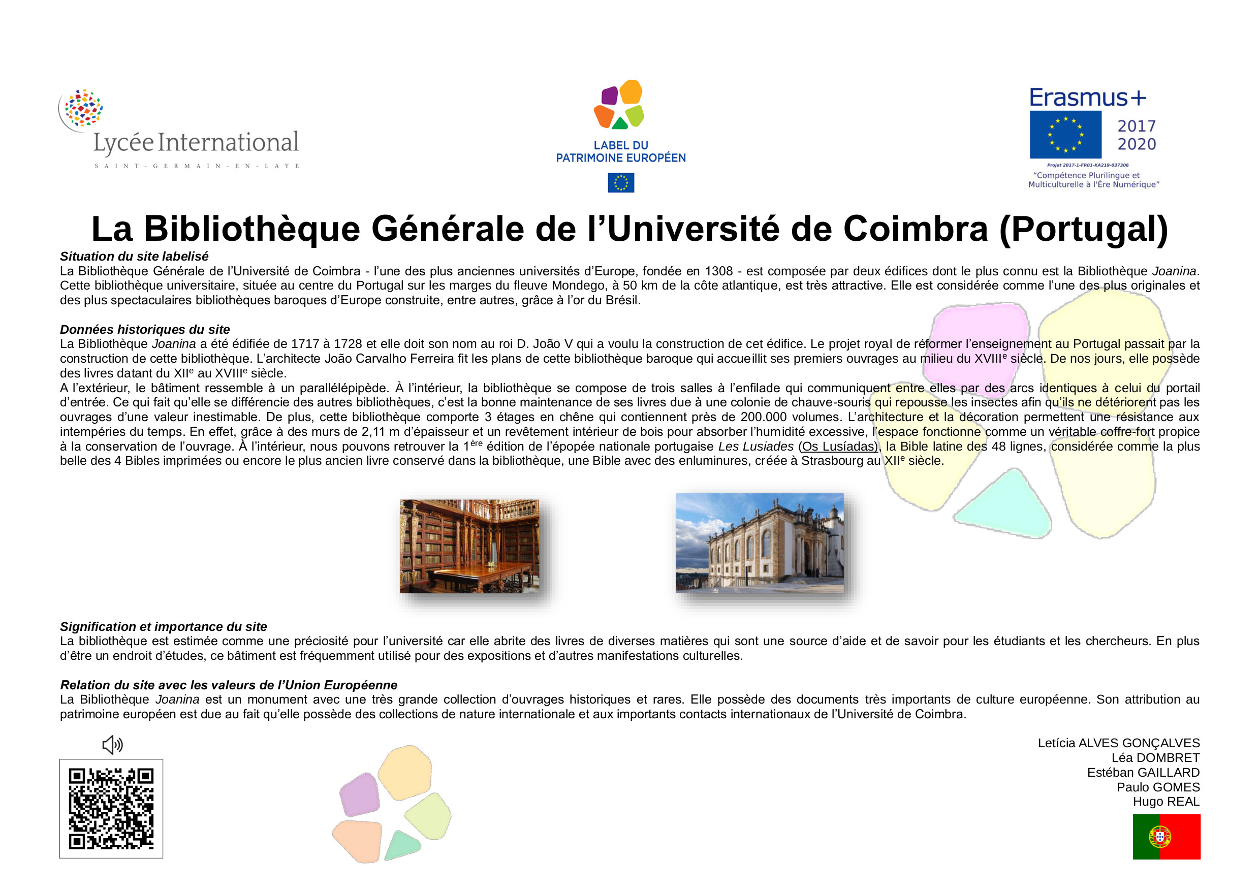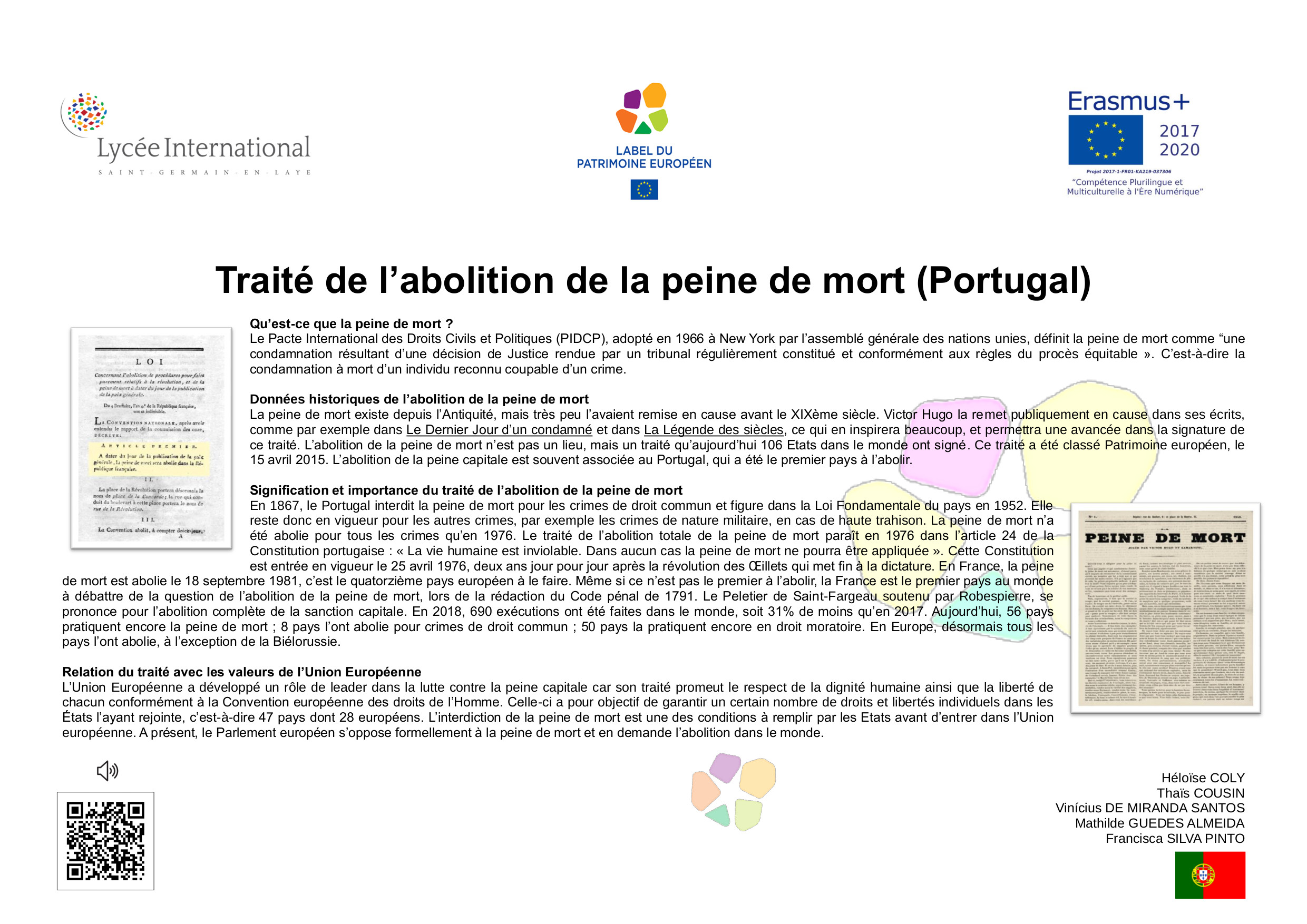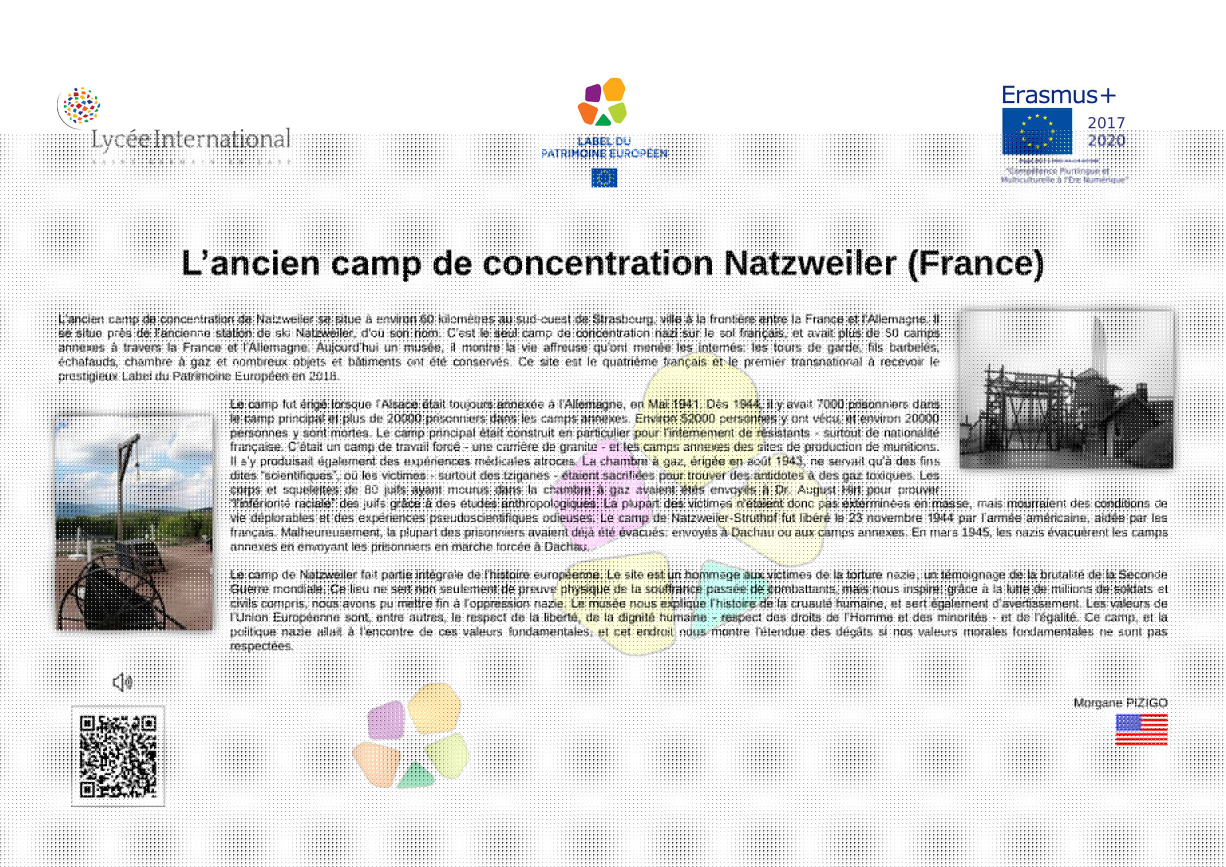 En 2005, à l’initiative de la France, différents États-membres de l’Union Européenne ont décidé de créer le Label du Patrimoine européen. Aujourd’hui repris par l’Union Européenne, le Label a pour objectif de mettre en valeur la dimension européenne de biens culturels, monuments, sites culturels, lieux de mémoire, etc.., témoins de l'histoire de l’Europe ou de la construction européenne.Ce label est décerné par l’Union européenne à des sites témoins de l'héritage européen et choisis pour leur valeur symbolique, le rôle qu’ils ont joué dans l’histoire européenne et les activités qu'ils proposent, qui doivent permettre de rapprocher les Européens de leur histoire commune et de l'Union européenne.Son objectif est d'aider les citoyens européens à mieux comprendre l’histoire de l’Europe et de la construction de l’Union ainsi que celle de leur patrimoine culturel commun, en particulier au regard des valeurs démocratiques et des droits de l’homme qui sous-tendent le processus d’intégration européenne, de sensibiliser les citoyens européens, notamment les jeunes, et de renforcer le dialogue interculturel, par l’éducation artistique, l’éducation à la culture et l’éducation à l’histoire.L'objectif de cette exposition est de diffuser, à travers les œuvres développées par les élèves de 2nde du Lycée International, les valeurs humanistes, la paix et l'espoir qui animent le projet d'unité européenne. La dimension internationale de notre établissement et sa vocation de lieu privilégié de rencontre culturelle et linguistique nous rend pleinement conscients et engagés dans l'effort collectif qui doit créer un avenir meilleur, plus juste, plus solidaire et plus responsable a l’égard de toute l'humanité et de la planète où nous habitons.
