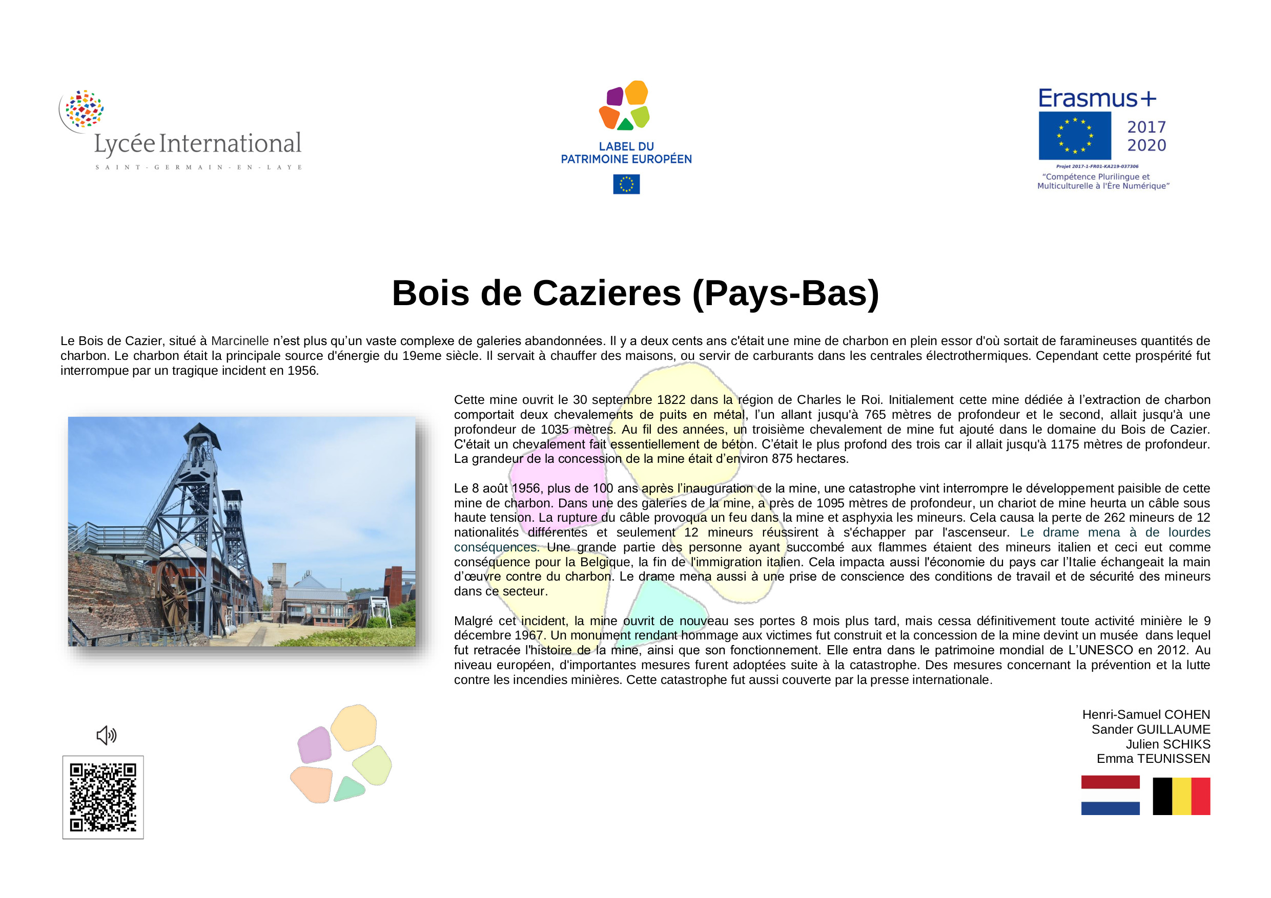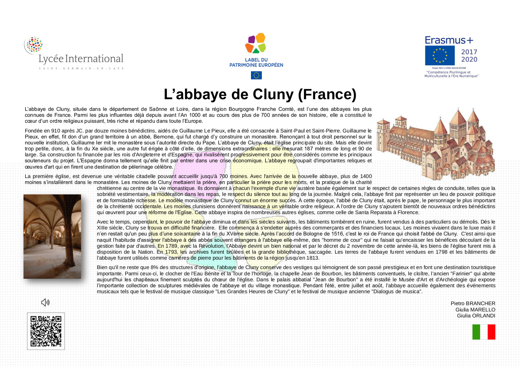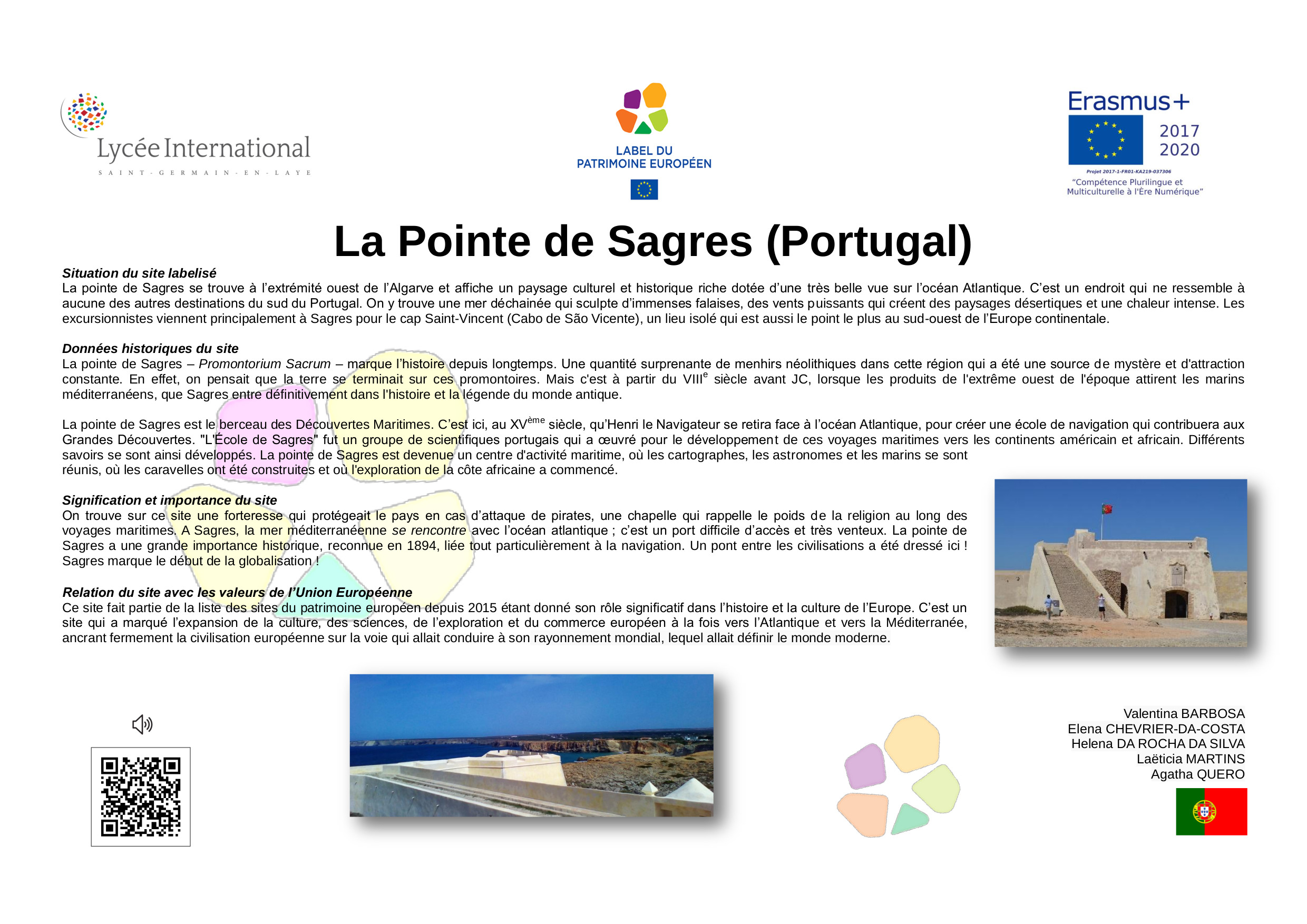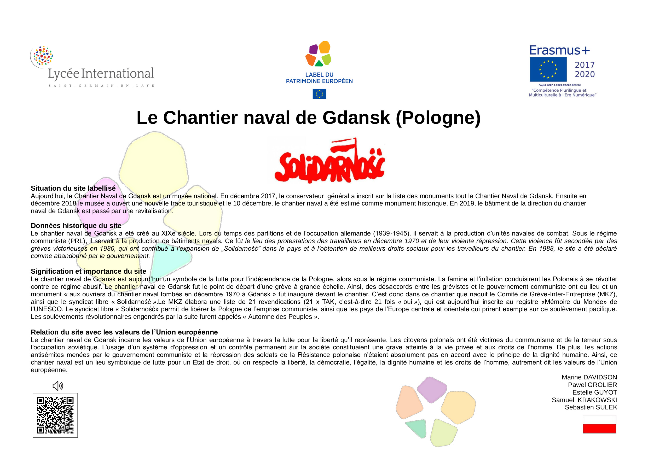 En 2005, à l’initiative de la France, différents États-membres de l’Union Européenne ont décidé de créer le Label du Patrimoine européen. Aujourd’hui repris par l’Union Européenne, le Label a pour objectif de mettre en valeur la dimension européenne de biens culturels, monuments, sites culturels, lieux de mémoire, etc.., témoins de l'histoire de l’Europe ou de la construction européenne.Ce label est décerné par l’Union européenne à des sites témoins de l'héritage européen et choisis pour leur valeur symbolique, le rôle qu’ils ont joué dans l’histoire européenne et les activités qu'ils proposent, qui doivent permettre de rapprocher les Européens de leur histoire commune et de l'Union européenne.Son objectif est d'aider les citoyens européens à mieux comprendre l’histoire de l’Europe et de la construction de l’Union ainsi que celle de leur patrimoine culturel commun, en particulier au regard des valeurs démocratiques et des droits de l’homme qui sous-tendent le processus d’intégration européenne, de sensibiliser les citoyens européens, notamment les jeunes, et de renforcer le dialogue interculturel, par l’éducation artistique, l’éducation à la culture et l’éducation à l’histoire.L'objectif de cette exposition est de diffuser, à travers les œuvres développées par les élèves de 2nde du Lycée International, les valeurs humanistes, la paix et l'espoir qui animent le projet d'unité européenne. La dimension internationale de notre établissement et sa vocation de lieu privilégié de rencontre culturelle et linguistique nous rend pleinement conscients et engagés dans l'effort collectif qui doit créer un avenir meilleur, plus juste, plus solidaire et plus responsable a l’égard de toute l'humanité et de la planète où nous habitons.